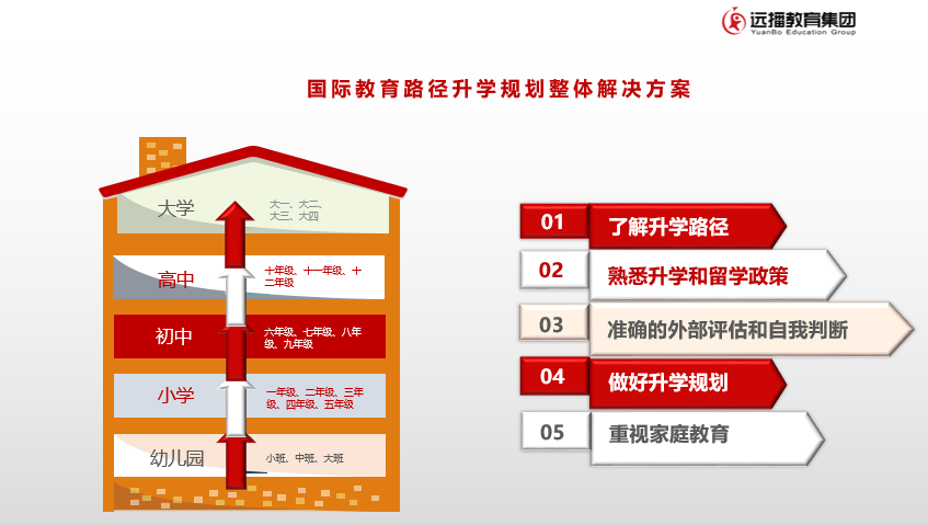 一个完整的国际教育路径升学规划要从五个方面展开,分别是:了解升学路径;熟悉升学和留学政策;准确的外部评估和自我判断;做好升学规划;重视家庭教育。